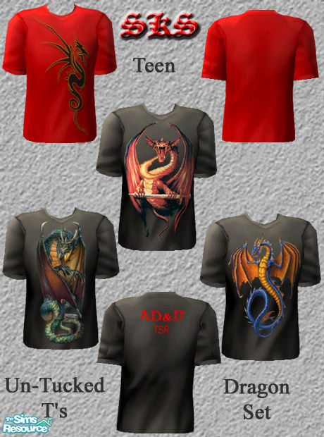 3 ultra cool Un-Tucked AD&D dragon T-shirts. The back of each features the AD&D / TSR Logo. With This set your getting a blue, green and red dragon all on basic black & a bonus red T shirt with a dragon silhouette. 4 shirts in all, for Teen Males. By: SKS