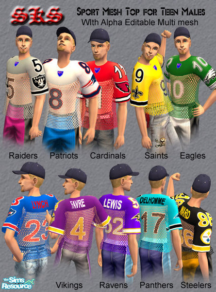 Extra baggy sport jersey for Adult Males, Featuring a selection of NFL teams. With solid shoulder panels and a course weave mesh/net body. Shirt hangs seperate from the torso allowing your sims skin to show trough. Works with all skin tones(Even custom). Set includes all 10 jerseys shown. By: SKS