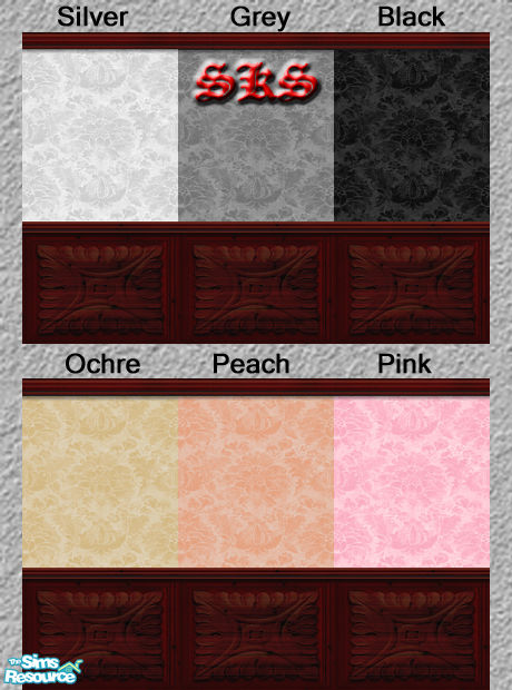 Set 1 of 3 seamless damask wallpapers. Walls feature a cherrywood panel wainscoting with a squared Acanthus leaf motif and crown molding. This set includes the 6 colors shown. Don\'t forget to get the matching carpet set. By: SKS
