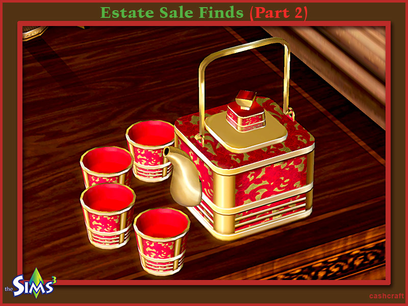 Gold embossed tea set with clean stylish lines and red trim. Created by Cashcraft for TSR.