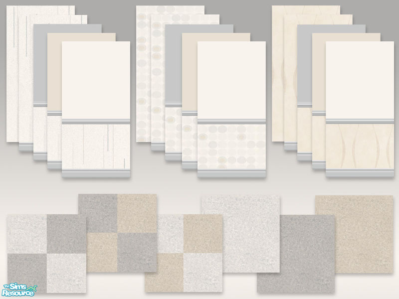 Set of wall paints, carpets and wallpapers with contemporary designs in neutral shades of stone, frosty greys and blues.