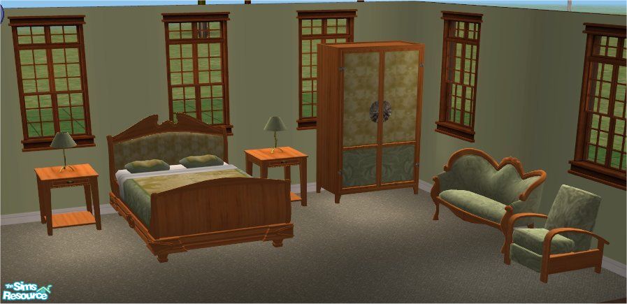 6 pieces all Maxis Recolors, Bed, Armoire, End Tables, Lamp, Recliner, And Sofa. Bedroom Set. My Recolor off of Maxis Bases. Green Feathered Like textures with Gold Accents. Hope everyone enjoys.