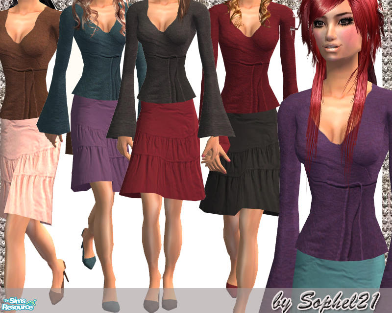set of 5 fashion outfits. Outfit comes with:skirt, cardigan with trumpets sleeves and highheels. (hair from model: peggysims2) ***req. mesh from Serasims - it is the second one on the link page***