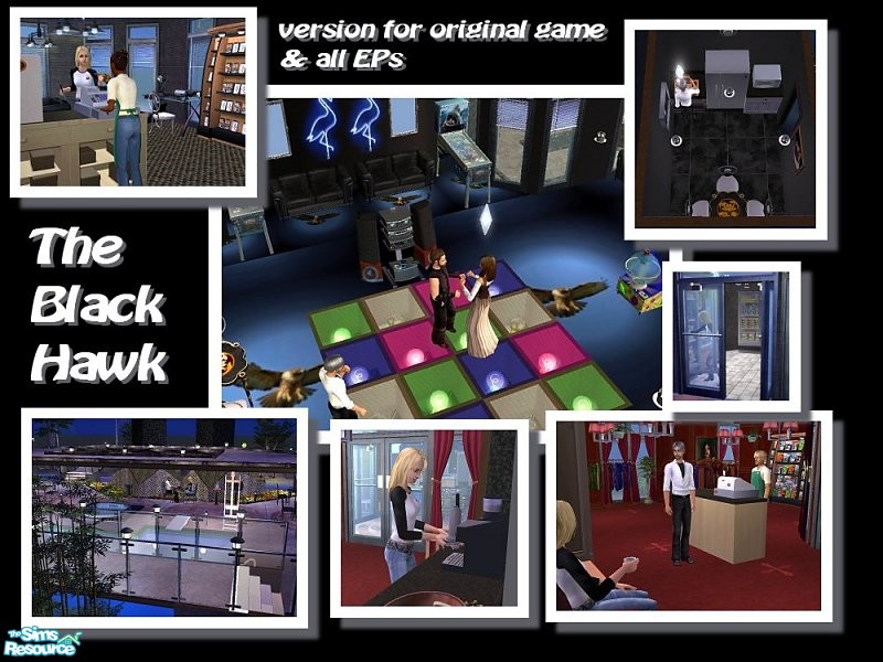 Stylish nightclub and shopping plaza for different clubbing styles, + kitchen, showers & espresso. Designed for ORIGINAL game & all EPs. (Note, by request a Nightlife version also added - 21 Jan 06.) No extra objects, no hacks. Custom walls and floors by Tiko (TSRAA) and others.