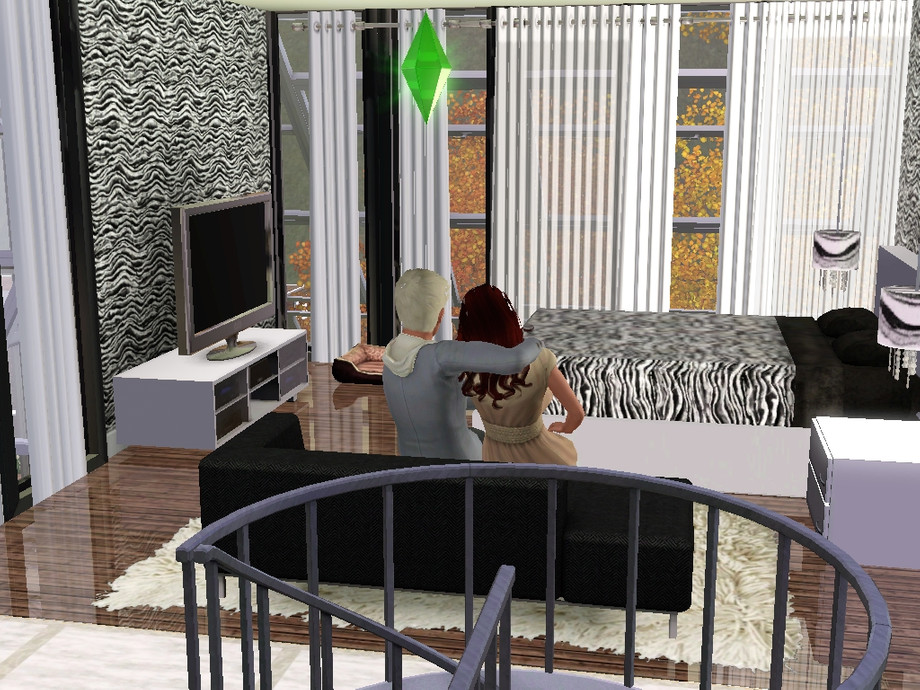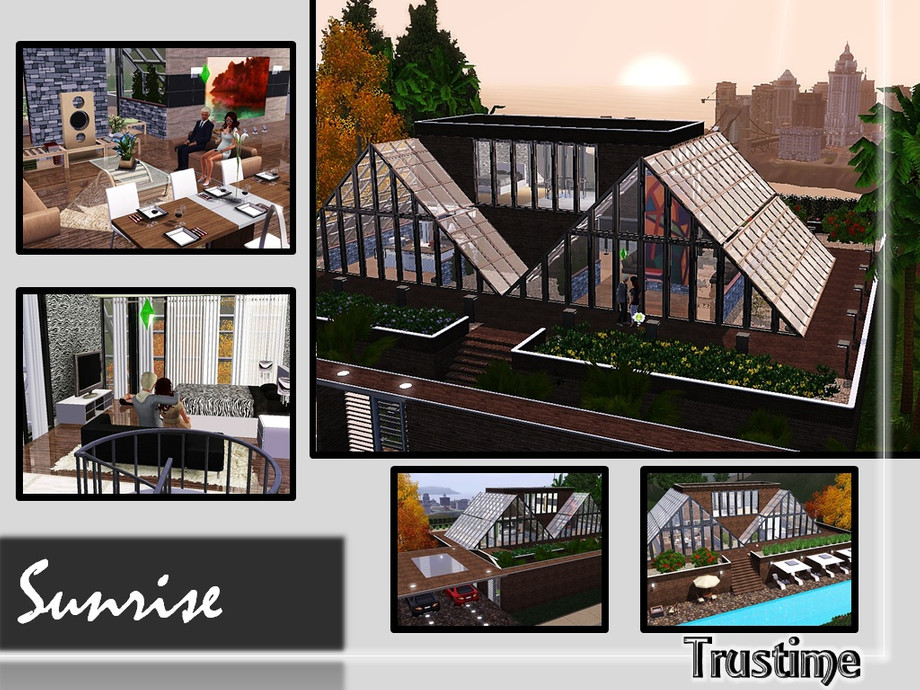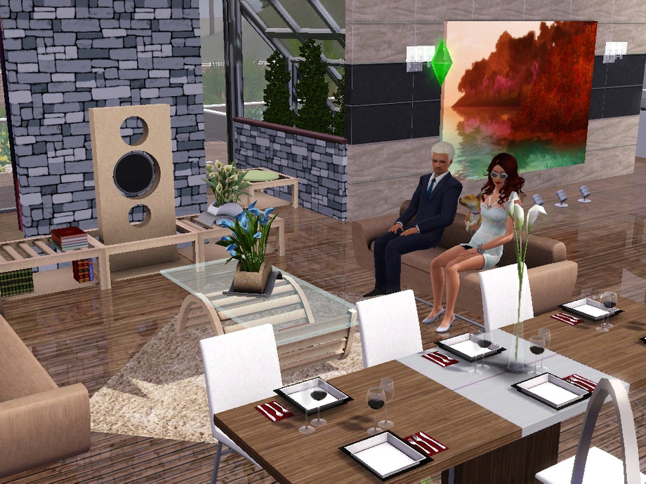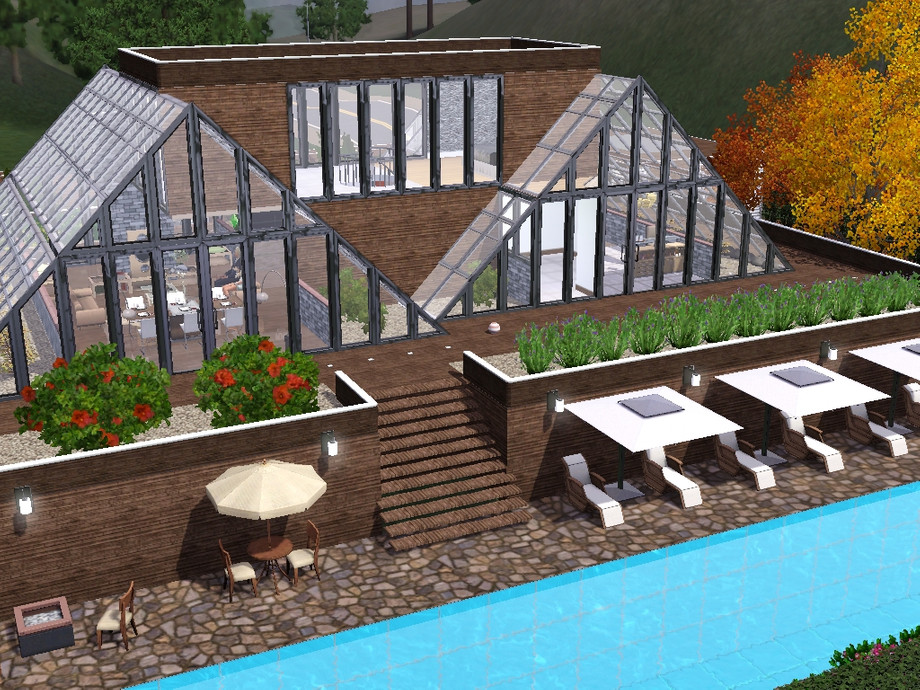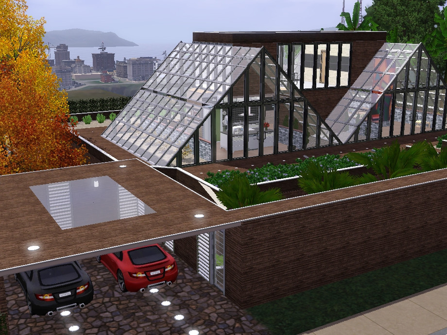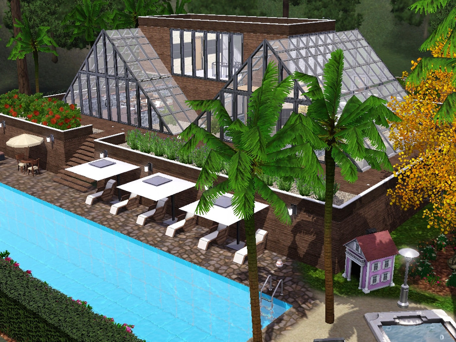 A modern, glass and futuristic house, that your couple of Sims will love it! Built in wood and glass, with a lovely garden and a big pool. Has a garage for two cars. The Hot Tub is outside, in the back of the house.