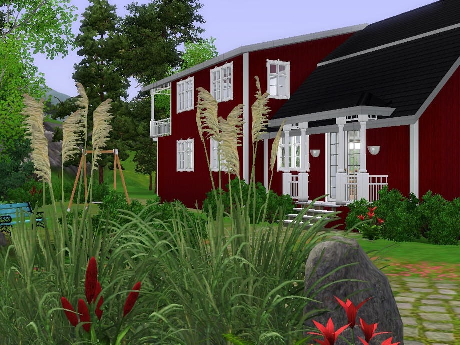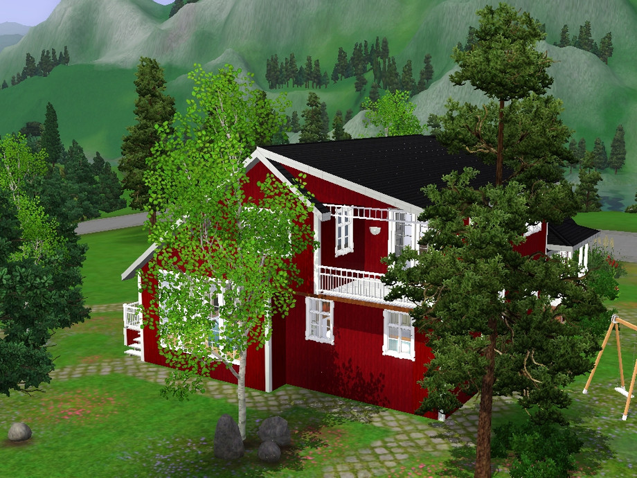 Sims 3 —  by philo — This red wooden house is probably the one that looks the most traditional. It has 2 bedrooms, a