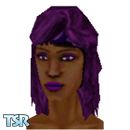 She has layered cut plum tinted hair and plum eyes and lipstick.