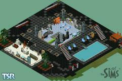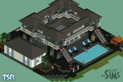 Upon first glance you see two buildings. The large black building is an entertainment room surrounded by an upper level porch. The smaller white building is the living quarters. It is a one room accommodation that supplies all of a Sims basic needs. The contrast is typical of needs versus wants! At any rate...your Sims can have it all. House stats: 1 party building with wrap around upstairs porch, a pool, a basketball court, a one room house with all necessary furnishings for a single Sim - ENJOY!