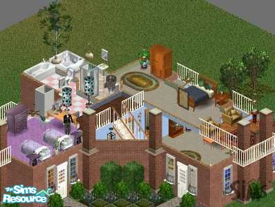 Beautiful, two story, large, brick home with balcony looking over entrance way. Two bedrooms, three baths, living, dining, and kitchen areas. All bedrooms are upstairs. It is fully furnished and also has landscaping. Made with all expansion packs for sims1. Enjoy!