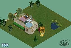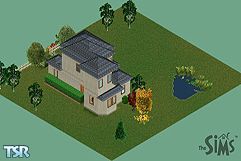 Sim tired of living in a cardboard box? Move in here instead. Inexpensively furnished living room, eat in kitchen, 1/2 bath downstairs, full bath upstairs. 2 bedrooms upstairs, though only one is furnished. Contains textures from all expansions, including downloads of Double Deluxe.