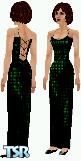 This evening gown, complete with straight hemline is created in shades of emerald green. The thin speghetti straps and daring criss-crossed low cut back come together to create a simple yet elegant appearance.