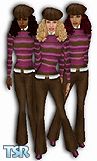 Fahionable 3 colored wool sweater covering a silk white shirt, with warm cocoa colored samt pants. All skin tones.
