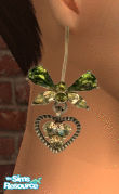 Green and gold earrings in the shape of a heart decorated with two bell shaped gems.