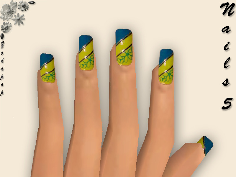 Blue and green two-tone nails with green flowers and black diagonal stripes.