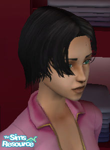 Short black hair with bangs brushed to the side.