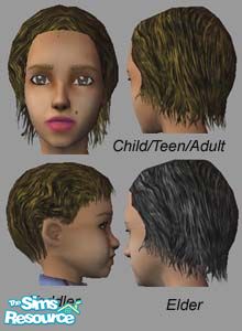 Short dark brown hair with no bangs and pretty golden highlights. Gramma's is black with gray highlights. This haircut fits perfectly with FSMCDesigns/Michael's headbands