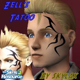 Zell's face Tatoo, for teens and adults of either sex. Zell Dincht is a promising 17-year-old martial arts student at Balamb Garden, in the game Final Fantasy VIII. This face-mark gives your sims an adventurous and radical touch, perfect for punky sims or an FF8 household.
