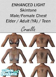 Male and Female Chest Enhanced (light) skintone. No real body bodyparts attached, just a full female bust with natural lines and chest hair for the males. Your Sims will look naturally enhanced.