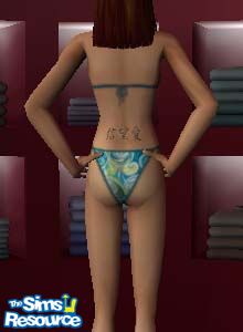 Features tattoo of the Chinese characters for the three virtures: faith, hope and love. Tattoo is on the lower back of female teens and adults.