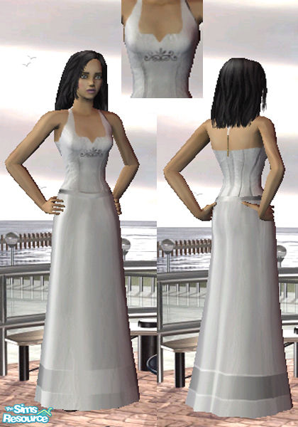 Your Sim's groom to be will be floored when he sees her in this elegant and sofisticated wedding dress. The classic white satin fabric with the platinum trim give this gown a modern twist.