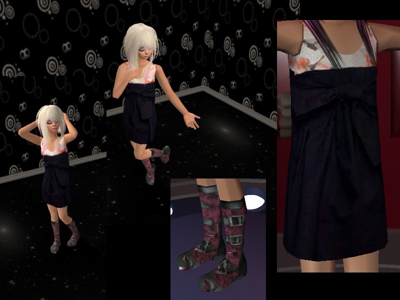 Black dress with big bow and white rose petals. Purple buckle boots.