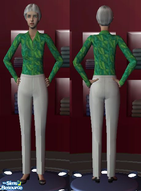 A beautiful silk green leaf-patterned blouse for the fashion minded elder sims female. White slacks are also available for download.