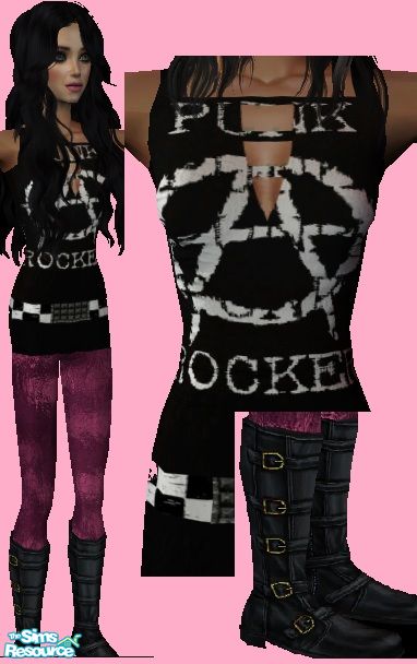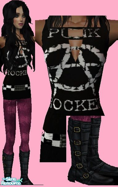Black \"punk rocker\" long top, checkered belt with buckle, purple smudge jeans and black boots. Thanks to doumeki for the mesh :)