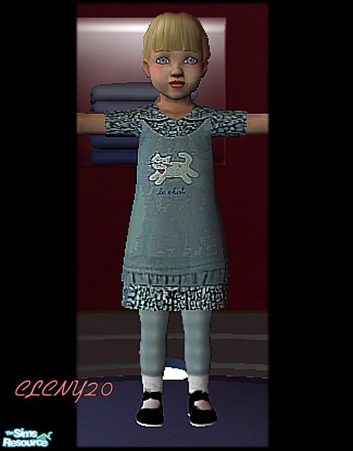 As requested by Leah2004, a blue-green dress, with a cute embroidery of a kitty on the chest. Complete with collard blue designed shirt underneath, and black Mary Janes.