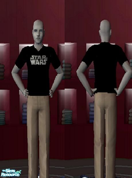A must have for any Star Wars fan. This is a black Star Wars T-Shirt with a silver/white Star Wars logo on the front. Let your sims show off their Star Wars fandom in style.