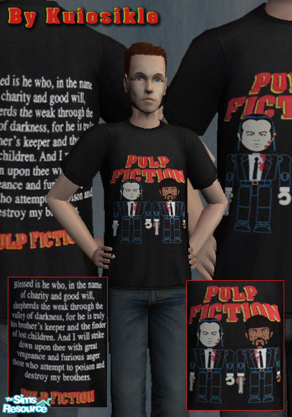 Is you sim a fan of Pulp Fiction? Then let him show it with this shirt featuring Jules and Vincent on the front and "Ezekiel 25:17" on the back.
