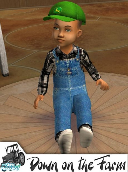Toddler's Overalls plus Cap with John Deere logo - fits both boy and girl toddlers - the cap is part of the clothing, not a hairstyle - it will work with all Maxis toddler hair, may not fit right with custom toddler hair meshes.