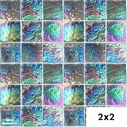 Florescent painted tiles in green, blue, pink, purple with white grout. 2x2