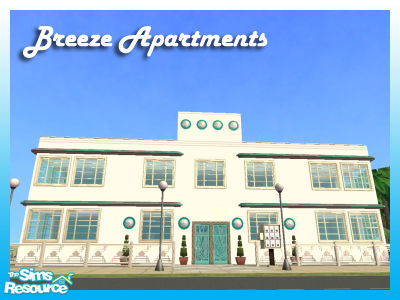 An apartment block inspired by the South Beach deco buildings. The ground floor apartments are perfect for the single Sims who enjoy spacious living. The upstairs apartments are suited for families or sharing with room mates. The patio is perfect for relaxing or partying in the warm summer evenings.
