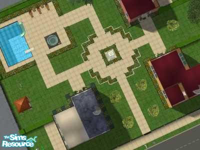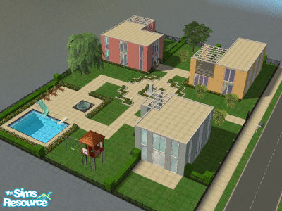 Courtyard Apts.- Has 3 units 2 have 2bed/1bath and the other is 1bed/1bath. Each unit has a snall fenced yard. There is a big pool, hot tub and samll play area. Maxis content only.