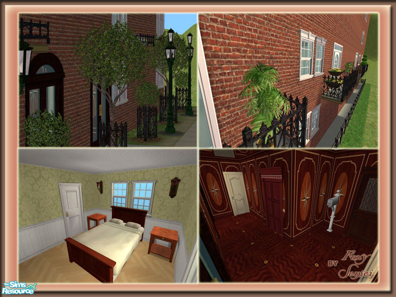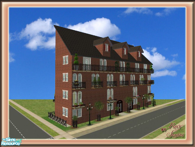 6 Parisian apartments. Elevator and fire escape. Beautifully landscaped. Furnished, if you use the testingcheats rule. No custom content- all Maxis original content.