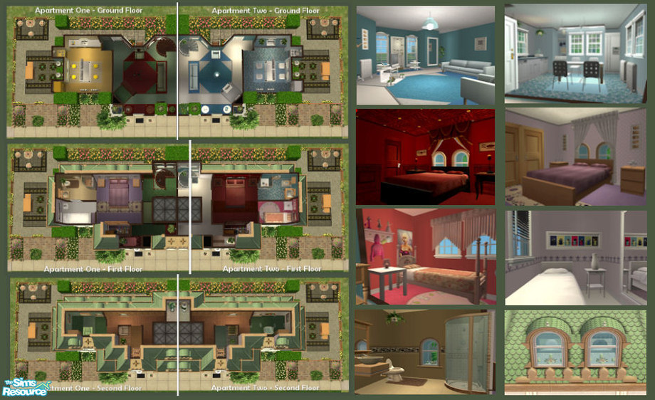 A block of two fully fursnished, decorated and landscaped apartments that each have a sitting room, two bedrooms, a kitchen, a main bathroom and two spare toilets and a reading room. Both have their own private back garden. There is no custom content included. The rent only costs 59 simoleons!