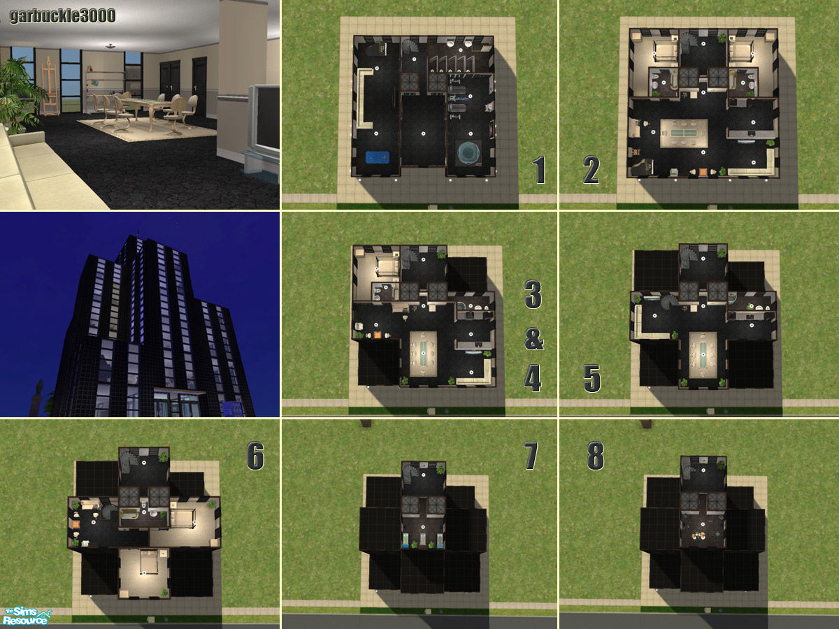 A small, minimalistic 8-storey version of the \"Sears Tower\", with 4 suites. 2x 2BDRM, and 2x 1BDRM. All with 2 baths and modern furnishings. The first floor contains spa and lounge, 7th floor is an arcade, and top floor is a jam studio. Rent $2701-3274. Fallingwater Windows by Stonetower.