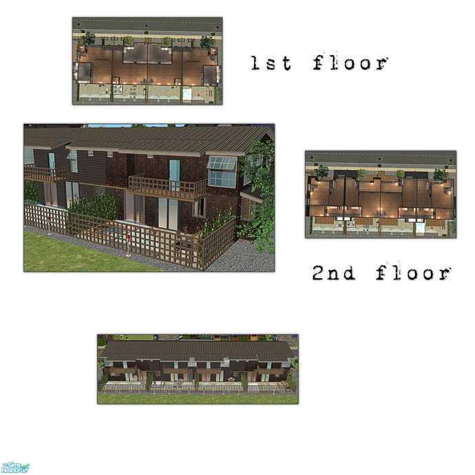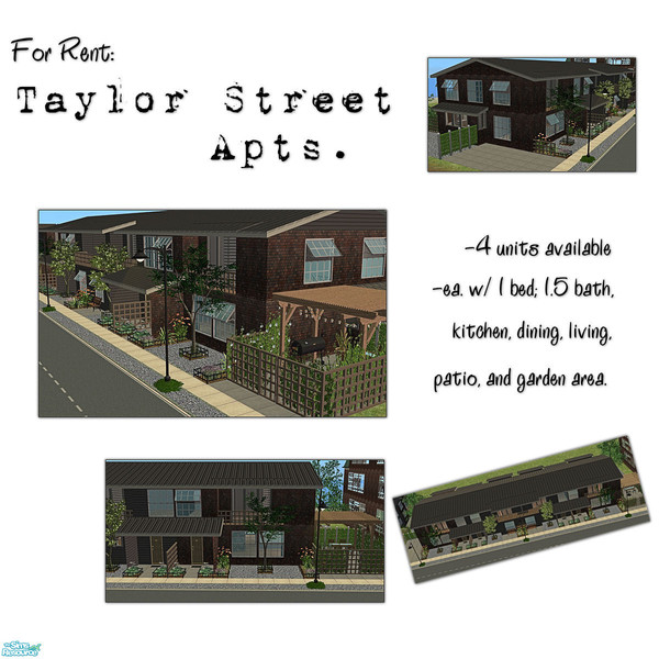 4 cozy yet spacious apartments for your city dwelling sims. Each unit features living and dining area; kitchen; 1 bed; 1.5 bath; open area for office etc.; balcony; patio with garden area. Also features 1 parking space and common area with grill, stereo and seating.
