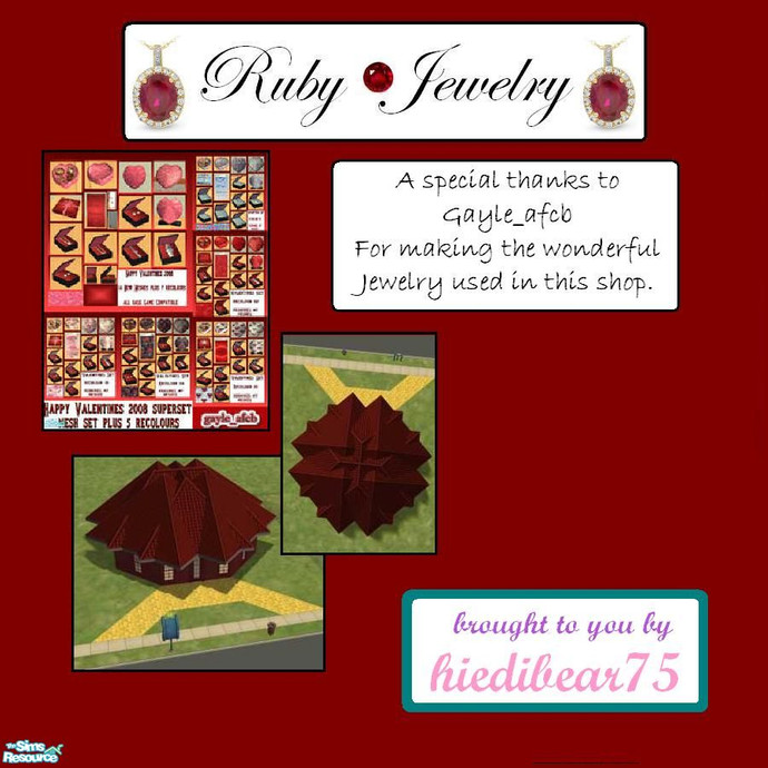A shop filled with jewelry that sparkles and is sure to bring a sparkle to anyone\'s eye men & women alike. Shaped like a ruby necklace \"Ruby Jewelry\". Thanks to gayle_afcb for her wonderful meshes and for allowing them as TSRAA.