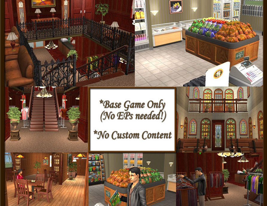 Downtown BV offers everything your sims need in one stop! Shopping? There\'s groceries, clothes, magazines, and games. Want fun? The park has swings, pond, bar-b-que area, restrooms, and more! Too tame? Try the local pub! TV, Darts, Pinball, or Chess. Or just visit the tiny church around the corner.