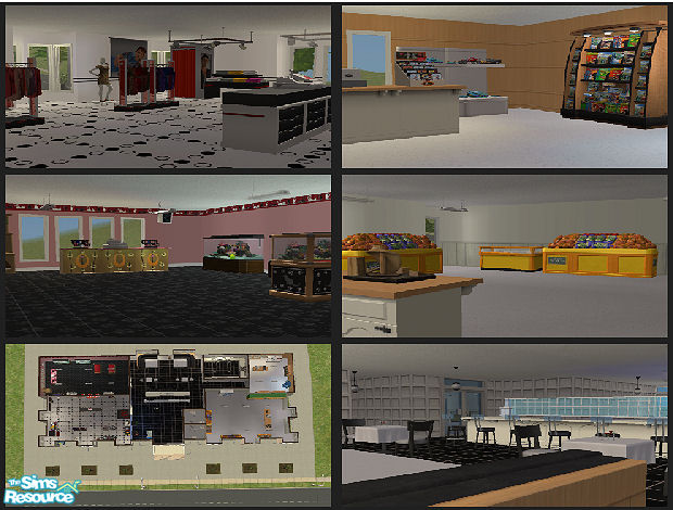 This shopping center has everything! Pet store, Game and mag stores, grogecy store, restaurant and H&M Fashon store. No Custom Content! Enjoy!