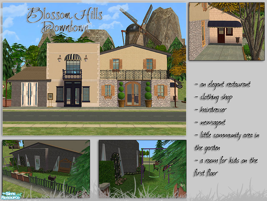 A community lot based on Blossom Hills Starters Series- with an elegant restaurant, clothing shop, hairdresser, newsagent, little community area in the garden and a room for kids on the first floor. Requires NL, OFB and SSN. No cc, Maxis only. I hope you will enjoy it :)