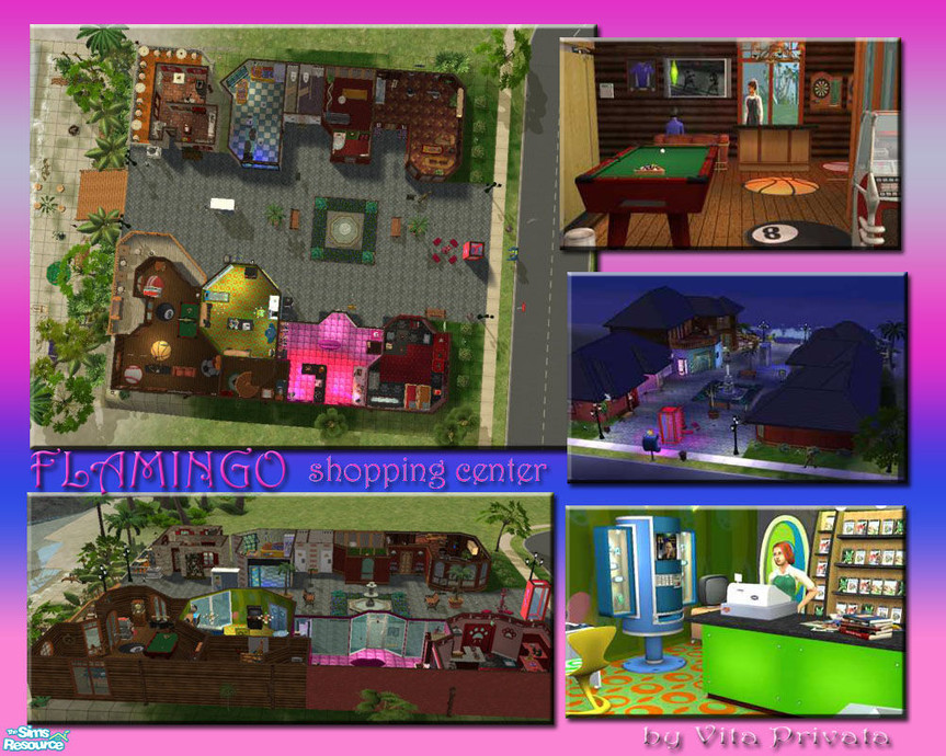 This off shore shopping center includes an Italian restaurant, Sport bar with a food counter on the second floor, a pet store, a spa, a fashionable clothing store, a game store, a grocery store and 2 restrooms. After shopping and eating your Sim can relax on the beach and look for hidden flamingos.