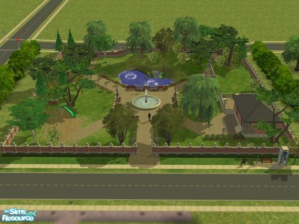 A beautiful park for your Sims 2 neighborhood! Includes a coffee shop, BBQ area, playground for kids and more. No custom content.