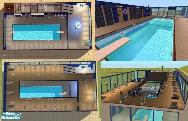 Have fun at Bluewater Pool and Gym. A community lot size 3x2. On upper floor there is a fully equiped gym with ballet room too. On the ground floor there is a swimming pool and sauna. Toilets, showers and changing booths. Have fun and get your sims fighting fit. You can run this lot as a business too