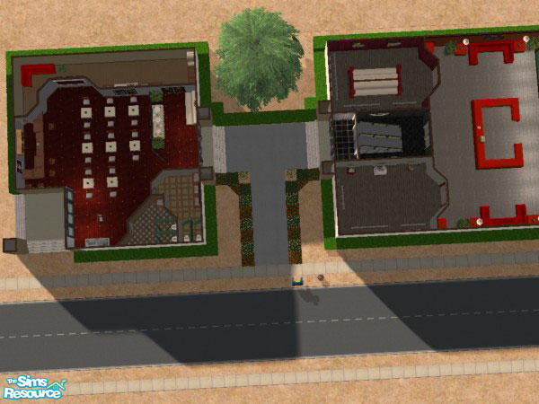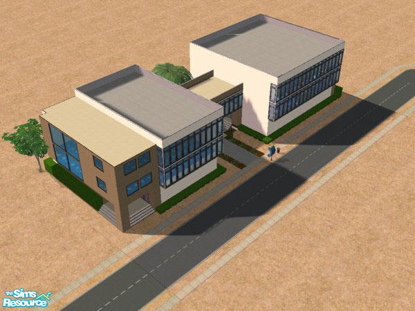 This is based off the Bauhaus design (in Germany). The bottom left level is an upscale restaurant with restrooms, the right is an art gallery with the availability to convert to a business. The top floor left is a poker hall with kareoke and expresso bar and restrooms, the top right floor is a club with an island bar, pool tables, and DJ.
