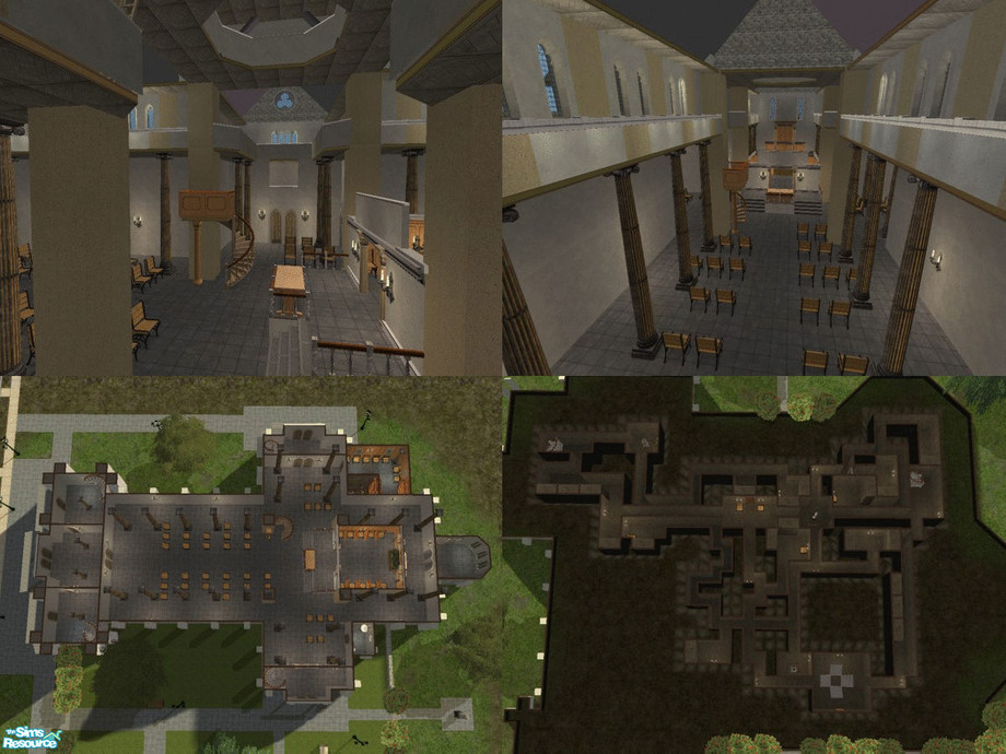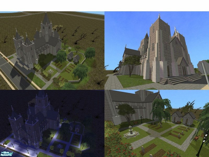 A beautiful gothic cathedral with a grave yard and an underground catacomb maze...