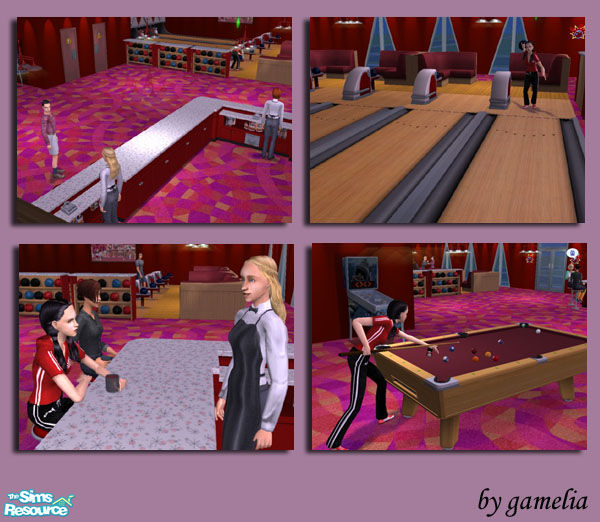 Bowling Alley on a 2x3 flat lot. Can be used as a community lot or purchased as a business lot for $90,091. Includes bowling lanes, pool table, video games, bar, and public restrooms. Sims love it! MAXIS CONTENT ONLY. NO CC. NO HACKS.