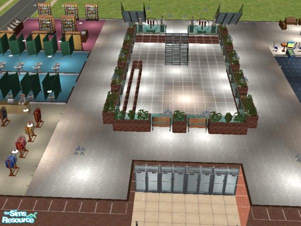 Shop till you drop. This mall is 2 story with a flat roof on top Has every thing your Sims need from clothes, food, magazines and video games. Also on second floor is an arcade and the roof has Hot tubs and grills