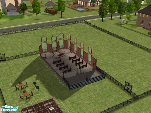 Sims are just dying to get into this place. Central piece is a cathedral (restrooms and dining added outside because a Sim's gotta do what a Sim's gotta do). I don't know if you can carry tombstones in your Sim's inventory to a community lot and dump it off, but this would be my place to do it.